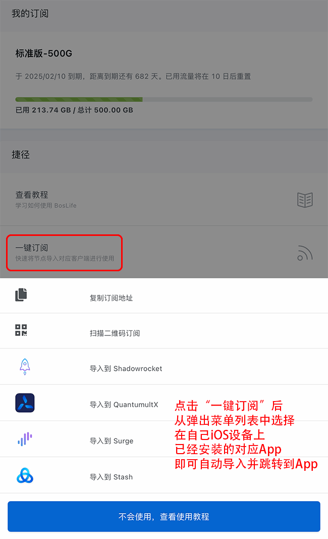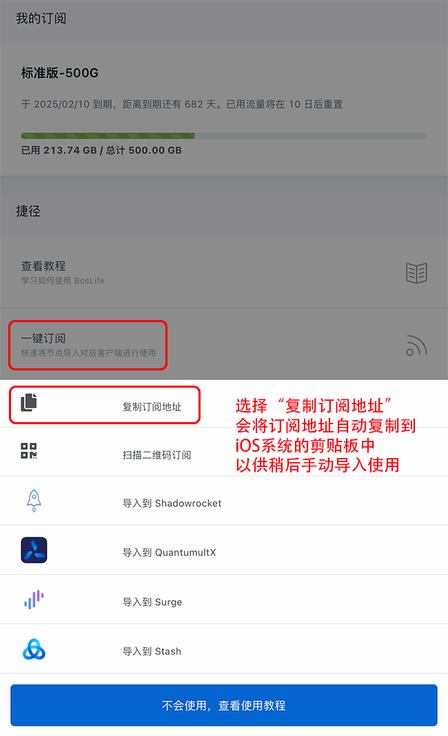 Shadowrocket 使用教程 Shadowrocket 有两种导入方式: 方式一:一键订阅(适用于较新版本的Shadowrocket客户端) 方式二:手动订阅(适用于所有版本的Shadowrocket客户端,不推荐) 请确保Shadowrocket App版本不低于2.1.70,否则可能无法正确支持Trojan协议。 方式一:一键订阅 1、使用Safari浏览器登录进入个人中心,在仪表盘页面下方的捷径区域找到“一键订阅”按钮,点击并选择“导入到Shadowrocket”选项。 点击后iOS系统会跳转到Shadowrocket客户端内并自动将节点订阅信息填好。  2、在客户端首页可以看到一键订阅生成的所有节点及相关信息。  3、进入配置选项页,建议使用默认配置文件即可。  4、进入设置选项页,按照下图将订阅设置项的“打开时更新”和“自动后台更新”选项同时开启。  5、回到首页点击上方全局路由可以更改代理模式,其中: “配置”为配置文件代理(即按照规则自动分流) “代理”为全局代理(即所有连接均通过代理) “直连”为绕过代理(即所有连接均不通过代理) “场景”适用于不同网络环境下自动切换代理模式 非高级用户推荐使用默认的“配置”模式进行自动分流。 点击首页右上方系统总开关即可开启代理服务。(参考方式一步骤2附图) 方式二:手动订阅 1、使用Safari浏览器登录进入个人中心,在仪表盘页面下方的捷径区域找到“一键订阅”按钮,点击“复制订阅地址”选项,  点击后会将订阅地址复制到iOS系统剪贴板中,以供下一步手动导入使用。 2、进入客户端首页,选择右上角 + 按键。  3、类型选择「Subscribe」,将第一步复制的订阅地址粘贴到URL栏中,在下方备注区域输入分组名称,最后点击右上角完成按钮保存。  4、回到客户端首页,可以看到客户端已经自动下载好所有节点及相关信息。  5、进入配置选项页,建议使用默认配置文件即可。  6、进入设置选项页,按照下图将订阅设置项的“打开时更新”和“自动后台更新”选项同时开启。  7、回到首页点击上方全局路由可以更改代理模式,其中: “配置”为配置文件代理(即按照规则自动分流) “代理”为全局代理(即所有连接均通过代理) “直连”为绕过代理(即所有连接均不通过代理) “场景”适用于不同网络环境下自动切换代理模式 非高级用户推荐使用默认的“配置”模式进行自动分流。 点击首页右上方系统总开关即可开启代理服务。(参考方式二步骤4附图)